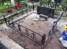 В ходе работы над данным заказом нам предстояло: переустановить покосившийся широкий памятник из чёрного гранита; покрасить обветшавшее от времени ограждение; обновить надписи на надгробье; установить прямоугольный цветник, а также выложить землю на участке гранитной брусчаткой. Приехав на место захоронения мы застали могилу в заброшенном состоянии: на всей её территории росла сорная трава, практически полностью скрывавшая памятник.